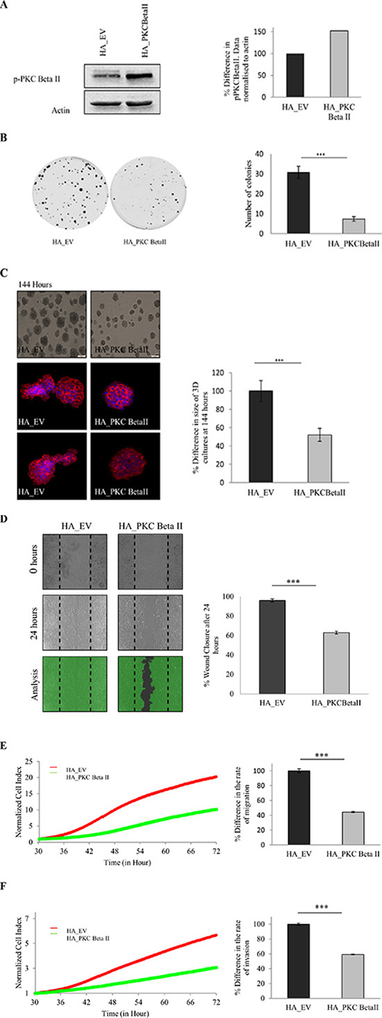 Figure 4: Effect of overexpression of PKC Beta II on colon cancer cells. The effect of overexpressing PKC Beta II in colon cancer cells was examined using HCT116 cells stably over expressing HA_PKCBeta II. (A) Representative western blot showing the expression of p-PKC Beta II in stable overexpressing HCT116 cells (n = 3). (B) Representative images demonstrating the difference in the cells ability to form colonies when overexpressing PKC Beta II (n = 3). (C) Images demonstrating the difference in the size of cells growing in a 3D matrix over 144 hours (n = 3). Bar graph represents the percentage difference in the size of 3D cultures at 144 hours. Confocal images are cells harvested and stained after 144 hours (n = 3). (D) Representative image of cells that were scored with a wound and allowed to migrate over 24 hours. Bar graph represents the percentage wound closer after 24 hours (n = 3). (E) Representative graph of cells migrating over a period of 72 hours analysed in real time on the xCELLigence system (n = 3). Bar graph represents the percentage difference in cell index. (F) Representative graph of cells invading over a period of 72 hours analysed in real time on the xCELLigence system (n = 3). Bar graph represents the percentage difference in cell index.