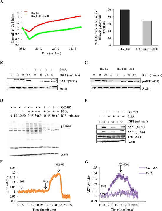 Figure 5: Effect of overexpressing and activating PKC Beta II on protection from cell death and IGF-1 mediated AKT phosphorylation. The effect of overexpressing PKC Beta II on protection from etoposide was examined using HCT116 cells stably overexpressing HA_PKCBeta II. Phorbol 12-myristate 13-acetate (PMA) was utilized to activate PKCs following which IGF-1 mediated AKT phosphorylation was examined. (A) Representative graph of cells proliferating following etoposide treatment at 16 hours. Data analysed in real time on the xCELLigence system (n = 3). Bar graph represents the percentage difference in cell index. (B) Representative western blot showing the effect of PMA treatment on the IGF-1 mediated expression of pAKT in HCT116 cells (n = 3). (C) Representative western blot indicating the difference in IGF-1 mediated phosphorylation of AKT when HCT116 cells are stably overexpressing PKC Beta II (n = 3). (D) Representative western blot showing the activation of PKC with the addition of PMA and the inhibition of PKC with the addition of Gö6983 (n = 3). (E) Representative western blot showing the effect of a PKC inhibitor on the PMA induced downregulation of pAKT (n = 3). (F) Normalised FRET ratio changes (mean +/− SEM) showing PKC activity from HCT116 cells co-expressing CKAR and RFP-tagged PKC Beta II treated with IGF-1, PMA and Gö6983. (G) Normalised FRET ratio changes (mean +/− SEM) showing AKT activity from HCT116 cells expressing plasma membrane targeted BKAR treated with IGF-1 and LY294002.