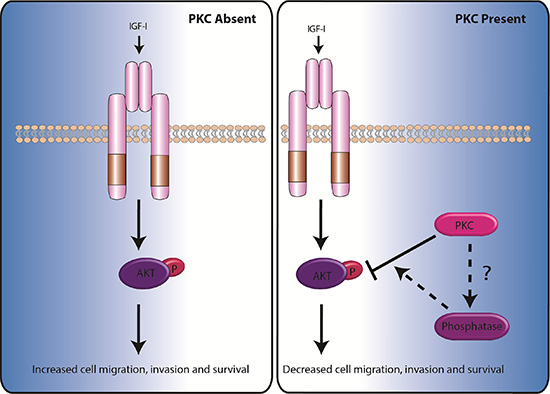Figure 6: Model demonstrating how the absence or presence of PKC determines the rate of cell migration, invasion and survival. For additional information on the signals required to activate PKCs see Dowling et al. (2015) [51].