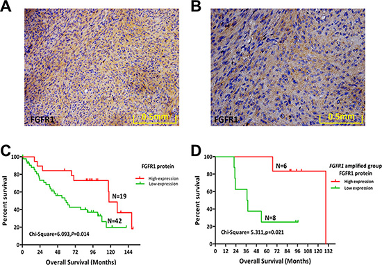 Figure 2: Protein expression levels of FGFR1 and its prognostic role in MPNST. (A) FGFR1 protein expression in a representative human MPNST tissue sample (20×). (B) FGFR1 protein expression in a representative human MPNST tissue sample (40×). (C) Kaplan–Meier plot of overall survival (OS) of 61 patients with MPNST based on level of FGFR1 expression. (D) Kaplan–Meier plot of OS in the FGFR1 amplified group (14 cases) of MPNST patients based on FGFR1 expression.