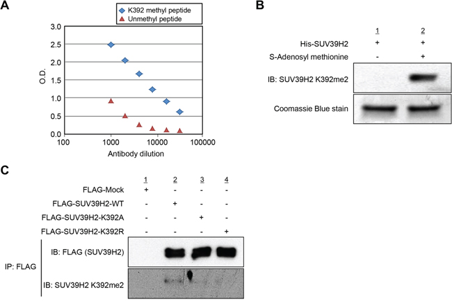 Figure 3: Automethylation of SUV39H2 is validated in vivo. A. Determination of the titer and specificity of the anti-K392 dimethylated SUV39H2 (Sigma-Aldrich) antibody analyzed by enzyme-linked immunosorbent assay (ELISA). A constant amount of K392 methyl peptide or unmethyl peptide has been coated into the wells of the ELISA, and tested with different dilutions of the antibody. B. His-tagged SUV39H2 recombinant proteins were incubated with or without the cofactor SAM at 30°C for 2 hours. Automethylated SUV39H2 protein was blotted with the anti-SUV39H2 K392me2 antibody, and amounts of loading SUV39H2 recombinant proteins were measured by staining with Coomassie Brilliant Blue. C. In vivo methyltransferase experiment was conducted in 293T cells overexpressing FLAG control empty vector (FLAG-Mock), FLAG-tagged SUV39H2 wild-type (FLAG-SUV39H2-WT), FLAG-tagged SUV39H2 K392A mutant (FLAG-SUV39H2-K392A) or FLAG-tagged SUV39H2 K392R mutant (FLAG-SUV39H2-K293R). Cells were lysed with RIPA buffer 48 hours after transfection, and samples were immunoblotted with anti-FLAG and anti-SUV39H2 K392me2 antibodies.