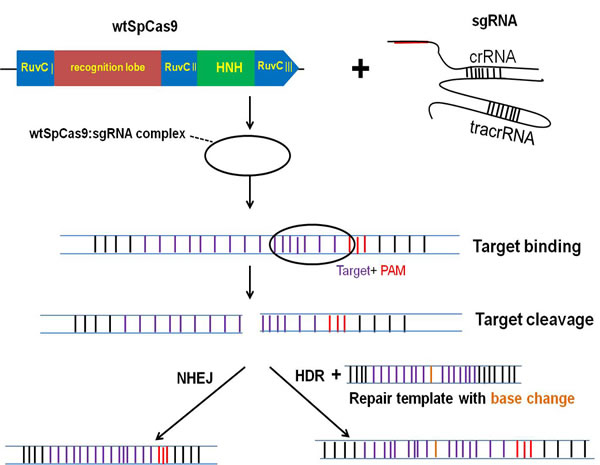 Figure 1: The CRISPR/Cas9 system for genome engineering.The CRISPR is composed of two major components including a CRISPR-associated endonuclease (Cas9) and a single guide RNA (sgRNA). The Cas9 from S. pyogenes (wt SpCas9) is shown in this figure as it is the most widely used in genome editing nowadays. After wt SpCas9 and sgRNA form a riboprotein complex, they can bind any genomic sequence with a protospacer adjacent motif (PAM), directing DNA double-strand breaks (DSBs) at the target site. DSBs are then repaired by either non-homologous end-joining (NHEJ) or homology-directed repair (HDR) pathway.