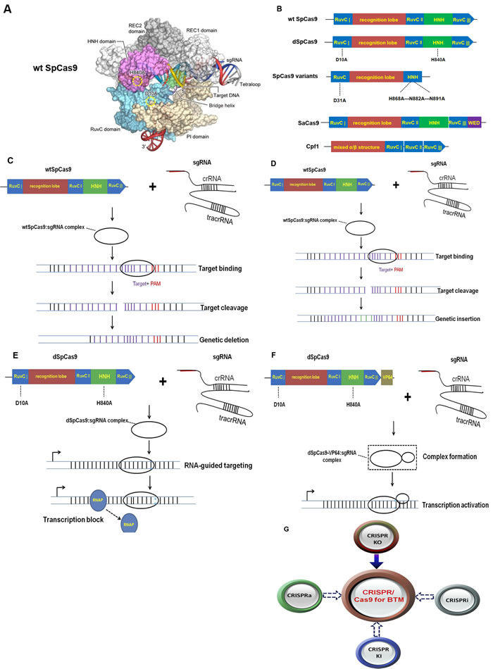 Figure 2: Proposed applications of the CRISPR/Cas9 system for brain tumor modeling. A. shows the crystal structure of wt SpCas9 referred to Zhang et al [70]; B. is the model graphs of wt SpCas9, dSpCas9, SpCas9 variants, SaCas9 and Cpf1; C. D. E. F. display the processions of four different types of CRISPR-mediated genome editing including CRISPR knock out (CRISPR KO), CRISPR knock in (CRISPR KI), CRISPR interference (CRISPRi) and CRISPR activation (CRISPRa), respectively; G. proposes four different sorts of CRISPR/Cas9 techniques are possibly involved in brain tumor modeling (BTM). CRISPR KO is presently successfully applied for BTM (as shown by solid arrow). We propose CRISPR KI, CRISPRi and CRISPRa are used for BTM (as shown by dotted arrows).