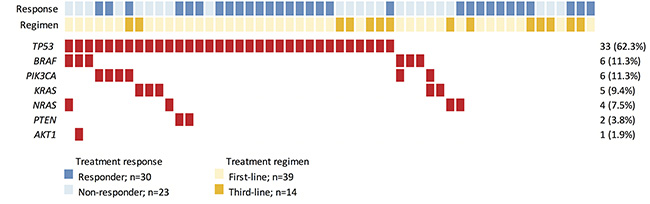 Since the launch of the first massively parallel sequencing platform in 2005, next-generation sequencing (NGS) technologies have evolved rapidly, revolutionizing the scale of genomic studies and providing powerful diagnostic tools for implementing precision medicine through high-throughput genomic analysis [15]. As NGS techniques continue to improve and decrease in cost, it has become feasible to routinely employ NGS in clinical settings to analyze large-scale genetic information regarding inter- and intratumoral gene alterations, allowing better stratification of patients when selecting personalized therapies. In the present study, we utilized NGS technology to analyze the EGFR signaling pathway genes EGFR, KRAS, HRAS, NRAS, BRAF, PIK3CA, AKT1, PTEN, HER2, and HER4 in a wild-type KRAS exon 2 cohort of 53 Taiwanese mCRC patients undergoing cetuximab treatment. Our results demonstrate that poor responses to cetuximab in CRC patients can be attributed to a combinational set of gene mutations in addition to mutations in KRAS exon 2.