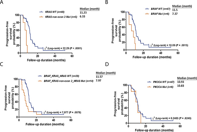 Although the KRAS exon 2 mutation has been established as an important biomarker for predicting responsiveness to anti-EGFR treatment, approximately 40~50% patients harboring wild-type KRAS exon 2 do not benefit from these targeted agents, suggesting the potential involvement of genetic alterations in the KRAS/BRAF and PI3K/AKT pathways downstream of EGFR. All of these genes have been associated with tumor growth and progression, and recent studies suggest that additional mutations in KRAS and NRAS, as well as downstream mutations in BRAF or PIK3CA, may cause resistance to anti-EGFR treatment [12]. However, these findings were based on clinical studies containing patients of different races in which few genes were analyzed, and the results were often contradictory [13]. Previous studies have found higher rates of KRAS mutations in Asian patients with small-cell lung carcinoma, reflecting an ethnic difference in cancer genomics [14]. However, factors influencing KRAS and other effectors downstream of EGFR in CRC specifically in Asian populations have not been systemically evaluated, particularly in the Taiwanese population. Additional molecular studies identifying other predictive biomarkers may help to optimize anti-EGFR therapies in mCRC patients.