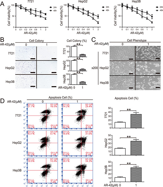 Figure 1: AR-42 reduces HCC cell viability. Cells were treated with AR-42 and quantified via CCK-8 assay (A). Cells were treated with AR-42. Colonies were stained with crystal violet (left) and quantified (right). Scale bars, 1 cm (B). Cells were treated with AR-42 and morphological changes were observed. The magnification is × 200. Scale bars, 200 μm (C). Cells were treated with AR-42, subjected to flow cytometry (left) and quantified (right) (D). Data represent the mean ± SEM, n ≥ 3. *P < 0.05, **P < 0.01.