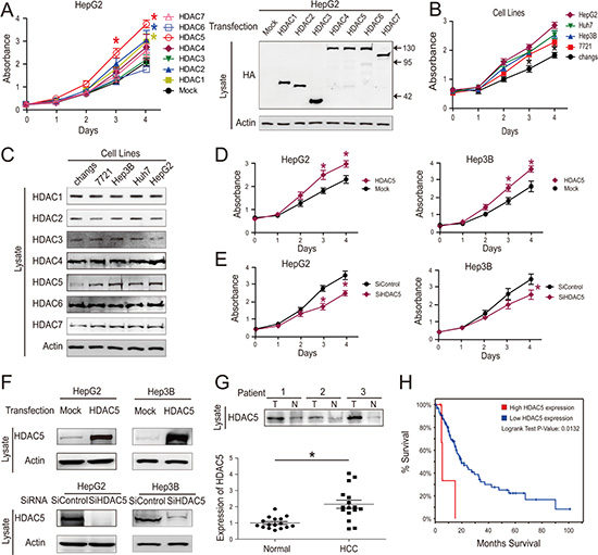 Figure 2: HDAC5 overexpression promotes HCC cell proliferation. After transfection with HDAC overexpression vector, cell growth was quantified via CCK-8 assay (left). Transfection were confirmed by western blotting (right) (A). Cell growth as quantified via CCK-8 assay (B). HDAC protein levels were detected by western blot (C). HepG2 and Hep3B cell proliferation was analyzed via CCK8 assay following transfection with HDAC5 overexpression vector (D). HepG2 and Hep3B cell proliferation was analyzed via CCK8 assay following siRNA transfection. (E) Transfection efficiency was confirmed by western blotting (F). HDAC5 protein levels in tumor (T) and adjacent normal tissues (N) from 16 HCC patients were detected (top) and quantified (bottom) (G). 5-year survival was reduced for 269 HCC patients with elevated HDAC5 mRNA expression. (H) Data represent the mean ± SEM, n ≥ 3. *P < 0.05, **P < 0.01, NS not significant.