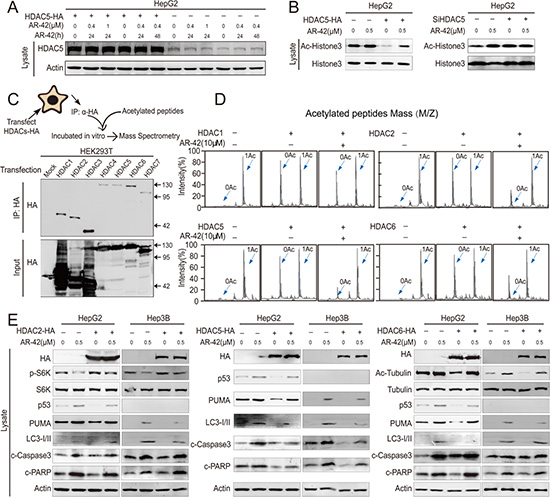 Figure 4: HDAC5 is the direct target of AR-42. HDAC5-overexpressing HepG2 cells were treated with AR-42 and subjected to western blot (A). Transfected HepG2 cells were treated with AR-42, and subjected to western blot (B). Schematic diagram of the in vitro deacetylation assay with HDAC5. The immunoprecipitated protein corresponding to HDACs-HA was subjected to western blot (C). The immunoprecipitated protein was incubated with acetylated peptides with or without AR-42, and the rate of deacetylation was determined using Mass Spectrometry (MS) (D). HDAC-overexpressing cells were treated with AR-42, and subjected to western blot (E). Data represent the Mean ± SEM, n ≥ 3. *P < 0.05, **P < 0.01, NS not significant.