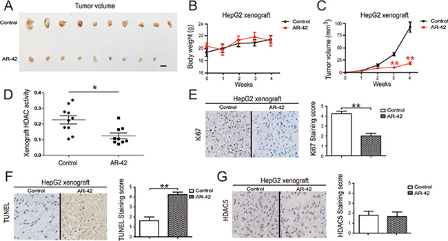 Figure 5: Effect of AR-42 on tumor xenograft models. Systemic delivery of AR-42 suppresses HepG2 cell xenograft tumor growth in nude mice. Tumors were photographed after all animals were sacrificed. Scale bars, 1 cm. (A) The body weights of tumor-burdened mice (B). The xenograft tumor sizes (C). Relative activity of HDACs extracted from HepG2 xenograft samples (D). Xenograft samples were stained with Ki-67 (left) and staining was quantified (right) (E). Xenograft samples were stained with TUNEL (left) and staining was quantified (right) (F). Xenograft samples were stained with HDAC5 (left) and staining was quantified (right) (G). Data represent the mean ± SEM, n ≥ 3. *P < 0.05, **p < 0.01, NS not significant.