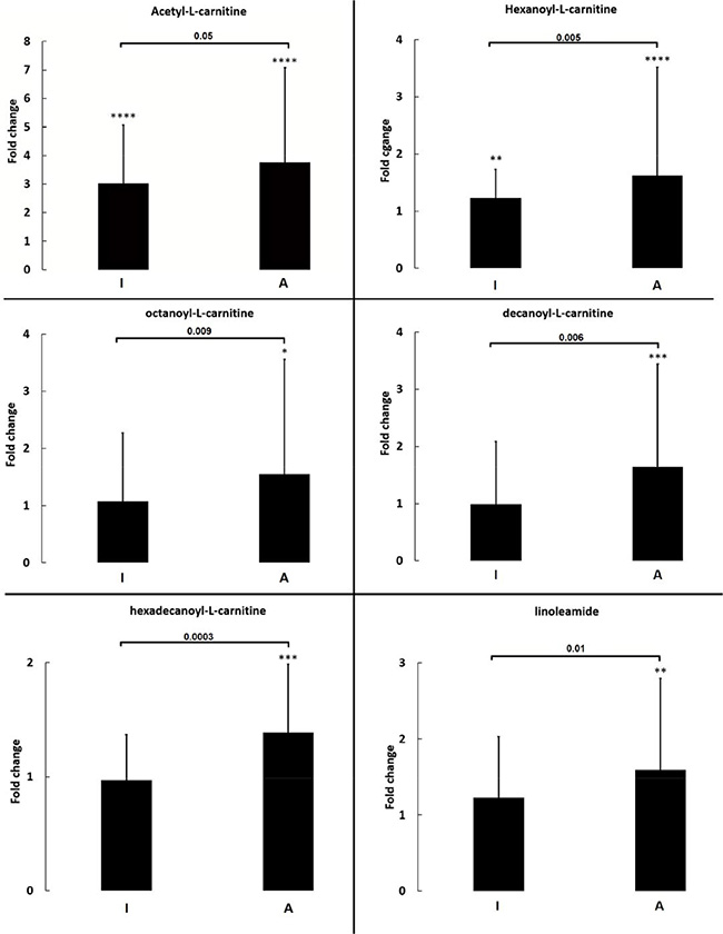 Acylcarnitines were quantitated according to the response factor of the respective internal standard. Labelled fatty acid amides were not commercially available, therefore the amount of free fatty acid amides (FFAAs) in the samples were expressed as areas under the respective peaks. For data generated by LC-QQQ, normality of distribution was tested by the Shapiro-Wilk test, and depending on normality, Welch’s t-test or Mann Whitney U-test were used to evaluate differences for the comparisons of C vs A, C vs I, and A vs I.
