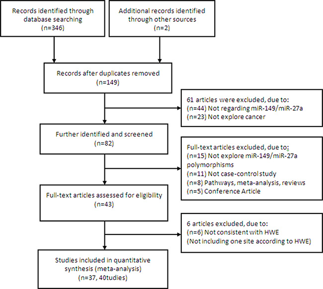 A comprehensive literature search was conducted using the PubMed, Springer, Elsevier, CNKI (Chinese), and Wanfang (Chinese) Digital Dissertations Databases for relevant articles published in English or Chinese up to July 2015 with key words ‘microRNA/miR-149/miR-27a’, ‘rs2292832/rs895819’,‘polymorphism’, and ‘cancer’. The full text of the candidate articles were examined carefully to determine whether they accorded with the inclusion criteria for the meta-analysis. The present study was conducted in accordance with PRISMA guidelines [66].