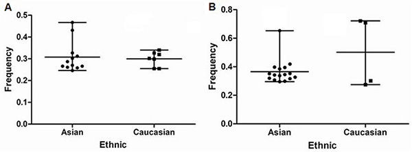 Figure 2: (A) frequencies of C allele in rs2292832 among controls stratified by ethnicity (B) frequencies of G allele in rs895819 among controls stratified by ethnicity.