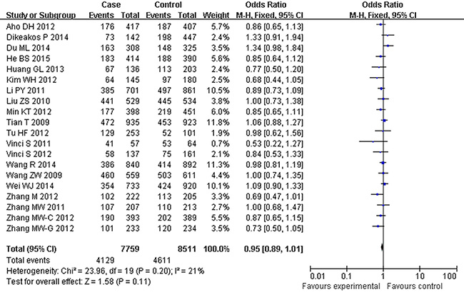 Table 3: Main results of pooled ORs of the rs2292832 and rs895819 polymorphisms on cancer risk in the meta-analysis
