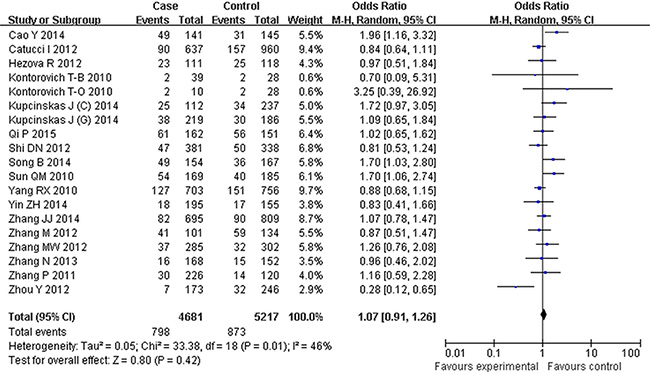 Data were extracted independently by two investigators (YJF and FJD). Data for analyses, including first author, publication year, cancer type, country of origin, ethnicity, study design, genotype detection methods and quality control or not. If discrepancies existed, consensus would be finally reached on discussion.