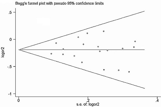 Figure 5: Funnel plot of rs2292832 polymorphism and cancer risk for dominant models (TT + CT vs CC). The horizontal line in the funnel plot indicates the fixed-effects summary estimate, whereas the sloping lines indicate the expected 95% CI for a given SE.