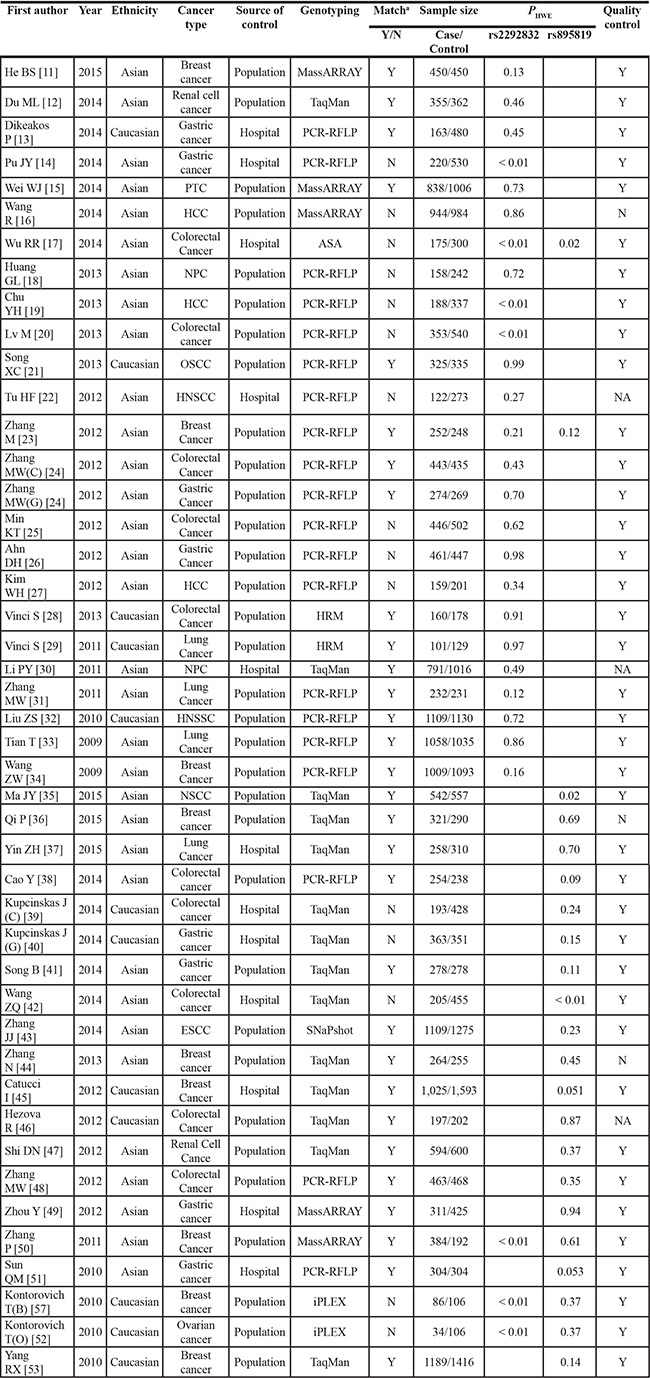 The inclusion criteria were as follows: 1) about the rs2292832/rs895819 polymorphisms and cancer risk, 2) based on case-control studies (including cohort studies), 3) sufficient published data for estimating an odds ratio (OR) with 95% confidence interval (CI), and 4) genotype distribution of control groups must be in accordance with the assumptions of Hardy-Weinberg equilibrium (HWE).