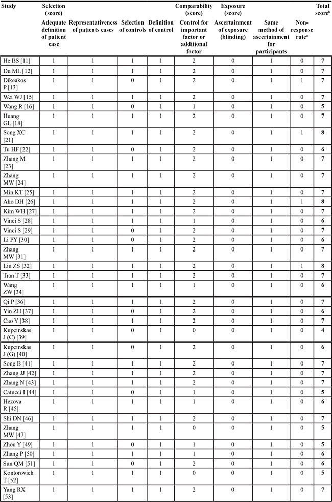 Quality assessment criteria were utilized to evaluate methodological quality of included studies based on Newcastle-Ottawa Scale (NOS) [67] for quality of case-control. A nine-point scale of the NOS (range, 0–9 points) has been developed for the evaluation, a high-quality study was defined as one with a score of ≥ 7.