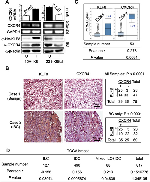 Figure 1: KLF8 upregulates CXCR4 expression associated with invasive potential. (A) Overexpression and knockdown of KLF8 induces and reduces CXCR4 expression in the 10A-iK8 and 231-K8ikd cells, respectively. Total RNA and protein lyaste were prepared from sub-confluent cells grown under uninduced (U) and doxycycline-induced (I) conditions. The levels of CXCR4 were determined by qRT–PCR (top graph), semi-quantitative RT–PCR (middle panel) or western blotting (bottom panel). Overexpression of HA-KLF8 and knockdown of KLF8 were examined by western blot. (B) Aberrant co-elevation of KLF8 and CXCR4 protein in the patient invasive breast carcinoma (IBC) tumors. IHC staining was performed for KLF8 or CXCR4 (brown) in the human breast cancer tissue microarray containing specimens in duplicate from 75 patient tumors or normal tissues. Images representing a benign sample negative for both KLF8 and CXCR4 (case 1) and an IBC sample positive for both KLF8 and CXCR4 (case 2) are shown. Correlation of CXCR4 and KLF8 expression is outlined in the tables. (C) Aberrant co-elevation of KLF8 and CXCR4 mRNA in the patient IBC tumors. Oncomine analysis was performed on an independent cohort of Finak dataset containing 6 normal and 53 IBC samples. Pearson’s correlation of KLF8 and CXCR4 was applied to Finak dataset downloaded from GEO (GSE9014). (D) The expression of KLF8 and CXCR4 is correlated in invasive breast cancers. RNA sequencing data downloaded from TCGA breast cancer (2015) were analyzed.