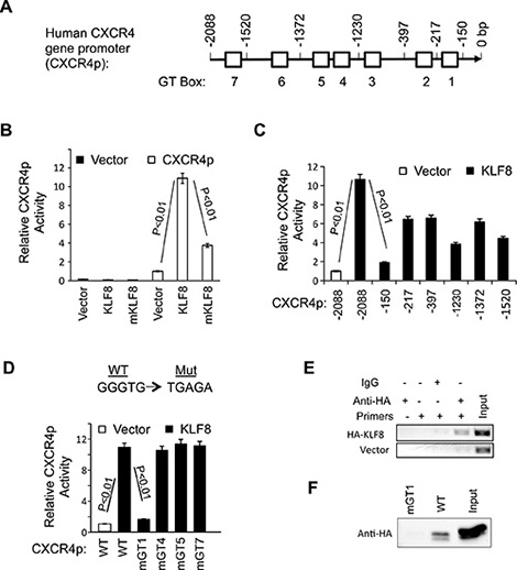 Figure 2: KLF8 upregulates CXCR4 at the level of transcription. (A) Schematic diagram of CXCR4p. Potential KLF8-binding sites (GT boxes) are shown. The CXCR4p was isolated from MDA-MB-231 genomic DNA and inserted in the pGL3basic luciferase reporter vector. (B) KLF8 activates the CXCR4p. The CXCR4p or control vector was co-transfected with KLF8 or activation domain-defective mutant (mKLF8) into NIH3T3 cells. Reporter activity was performed as described in Materials and Methods. (C) KLF8 responsive site is located between −150 and −217 bp of the CXCR4p. Serial CXCR4 truncation mutants were constructed and tested for changes in the promoter activation by KLF8. (D) The GT-box 1 is required for KLF8 to activate the CXCR4p. Indicated GT boxes were mutated (mGT) and tested for changes in the promoter activation by KLF8. (E, F) KLF8 directly binds CXCR4p at the GT-box 1 site. HA-KLF8 was overexpressed in HEK293 cells. The cells were processed for either ChIP assay using primers spanning the GT-box 1 (E) or BOP assay using oligos spanning the wild type GT1 (WT) or its mutant (mGT1) (F) as described in Materials and Methods.