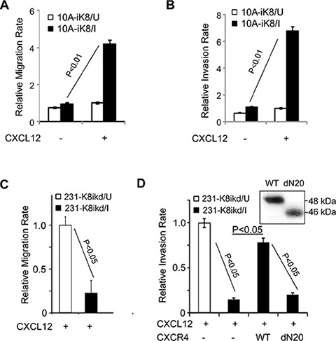 Figure 3: KLF8 promotes cell migration and invasion towards CXCL12. (A, B) Overexpression of KLF8 increases migration and invasion towards CXCL12. The 10A-ik8 cells grown under U or I conditions were subject to Boyden chamber migration Assay (a) or Matrigel invasion assay (b). (C, D) Knockdown of KLF8 inhibits CXCR4-dependent migration and invasion towards CXCL12. The 231-K8ikd cells grown under U or I conditions with or without overexpression of CXCR4 (WT) or its ligand-binding defective mutant (dN20) were subject to Boyden chamber migration Assay (c) or Matrigel invasion assay (d). No detectable migration or invasion was observed towards serum-free medium in the absence of CXCL12. Inset, ectopic expression of CXCR4 and the dN20 mutant were verified by anti-HA western blotting.