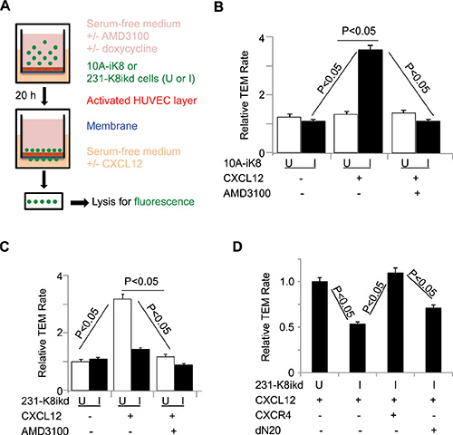 TEM assay was performed using the CytoSelect Tumor TEM assay kit (CBA-216, Cell Biolabs, Inc. San Diego, CA, USA). Briefly, HUVEC cells (25,000–50,000) (CRL-2922, ATCC, Manassas, VA, USA) were allowed up to 72 hours to form a monolayer on the upper surface of the membrane inside the insert and then activated by overnight serum starvation or TNFα treatment. The 10A-iK8 or 231-K8ikd cells (50,000) were incubated with the Cytotracker dye for 1 hour prior to further incubation in the insert on top of the HUVEC monolayer in the presence or absence of doxycycline. Depending upon specific experimental need, AMD3100 (35 ng/ml) was included to inhibit CXCR4 prior to and during the 22-hour assay time. The cells that migrated through the HUVEC monolayer were lysed and quantified using a Fluorescence multi-plate reader (PolarStar Omega, BMG LabTech, Cary, NC, USA).