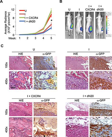 To determine the extent to which CXCR4 contributes to primary breast tumor progression downstream of KLF8, we injected the 231-K8ikd cells, the 231-K8ikd cells with stable overexpression of CXCR4 or its dN20 mutant into the mammary fat pad, induced the knockdown of KLF8 in vivo and examined the growth and invasion of the orthotopic tumor. The 231-K8ikd cell line stably expresses a GFP-luciferase fusion protein for tracking the tumors by live bio-imaging [16]. As expected, knockdown of KLF8 (I) significantly slowed down the tumor growth (Figure 6A and 6B, compare I with U). However, this reduction was completely prevented by overexpression of CXCR4, but not its dN20 mutant (Figure 6A and 6B, compare I+CXCR4 or I+dN20 with I). Histological analyses revealed that the dramatic inhibition of the tumor invasion into the surrounding tissues by knockdown of KLF8 (Figure 6C, compare I with U) was also well prevented by overexpression of CXCR4, but not its dN20 mutant (Figure 6C, compare I+CXCR4 or I+dN20 with I).