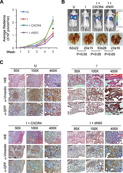 Figure 7: KLF8 activation of CXCR4/CXCL12 signaling is required for lung metastasis. (A, B) Overexpression of CXCR4 but not the dN20 mutant prevents lung metastasis from inhibition by KLF8 knockdown. The 231-K8ikd, 231-K8ikd/CXCR4 and 231-K8ikd/dN20 cells were injected into the tail vein of the mice. The mice were fed with Dox-diet (I) or control diet (U). The lung metastatic rate was followed up for 5 weeks by BLI analysis (a). *P < 0.05 between the U and I groups and between I + CXCR4 and I + dN20 groups. Representative BLI images, metastatic nodules on the whole mount lungs and statistic values in the end of week 5 are shown (B). (C) Histological evidence supporting the role of CXCR4 downstream of KLF8 for lung metastasis. The above-described lungs were processed for H/E and IHC staining with antibodies against GFP and human vimentin.
