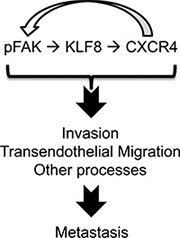 In this report, we show strong evidence that KLF8 directly activates the CXCR4 gene promoter. This activation causes an increased CXCR4 expression and subsequent feed-forward activation of FAK, resulting in CXCR4/CXCL12-dependent increase in migration, invasion, TEM and metastasis of breast cancer cells. These novel findings may guide development of more effective and less toxic, targeted therapeutic strategies.