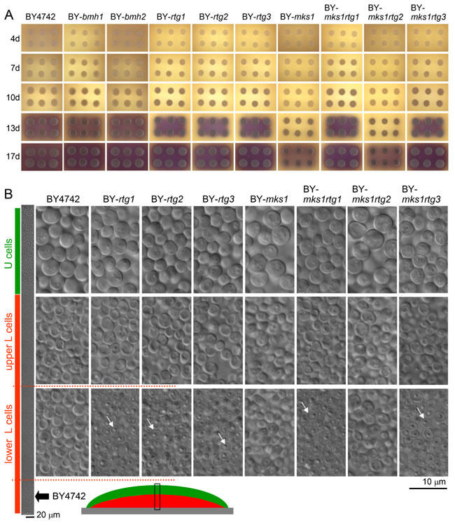 With the aim of analyzing possible function(s) of the RTG signaling pathway in developing colonies, we prepared a series of strains derived from Saccharomyces cerevisiae BY4742 (wt) with individually deleted genes involved in the RTG signaling cascade. We deleted genes for the activators Rtg1p, Rtg2p and Rtg3p and for the major negative regulators identified thus far, i.e., Mks1p, Bmh1p and Bmh2p. Colonies of all knockout (KO) strains (Table 1) were able to pass through the same developmental phases as colonies of the wt strain, although colonies of the BY-rtg1, BY-rtg2 and BY-rtg3 strains exhibited slightly slower growth than wt colonies, which caused a slight delay in colony entry to the alkali phase (Figure 1A). A more prominent growth delay was evident in BY-mks1 colonies. The growth of BY-bmh1 and BY-bmh2 colonies was similar to that of wt colonies, which is consistent with findings that Bmh1p and Bmh2p can substitute for each other. Preparation of the BMH1/BMH2 double KO strain was unsuccessful, indicating synthetic lethality of the double deletion, as described in some strain backgrounds [28, 29]. Microscopic analysis of cross-sections of 15-day-old giant colonies using Nomarski contrast showed that all colonies differentiated into U and L cells with typical morphological features. However, in contrast to wt colonies, in colonies formed by the BY-rtg1, BY-rtg2 and BY-rtg3 strains, a large subpopulation of dead shrunk cells (the cells with reduced cellular content) appeared in the lower layers of the L cell population (Figures 1B and S1). These cells were phenotypically similar to the yeast cells undergoing regulated cell death that have been identified in colonies [24]. These data showed that the inability to activate the RTG pathway negatively affects the survival of L cells and that the L cell population is not homogeneous but that smaller subpopulations exist that behave differently in certain aspects.