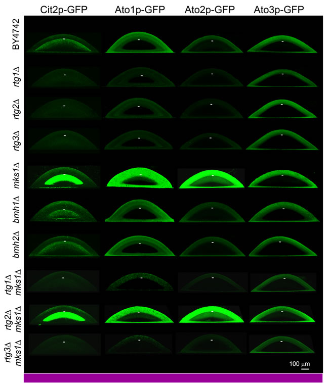 Mks1p-Rtg regulation of different gene targets in the U and L cells of differentiated colonies during the alkali phase is shown above. Next, we determined whether (and, if so, how) RTG genes and the repressor Mks1p are involved in the regulation of CIT2 and ATO genes in acidic-phase colonies, i.e., before the formation of fully developed U and L cells. Hence, we analyzed acidic-phase microcolonies of the above-described wt and KO strains by 2PE-CM.