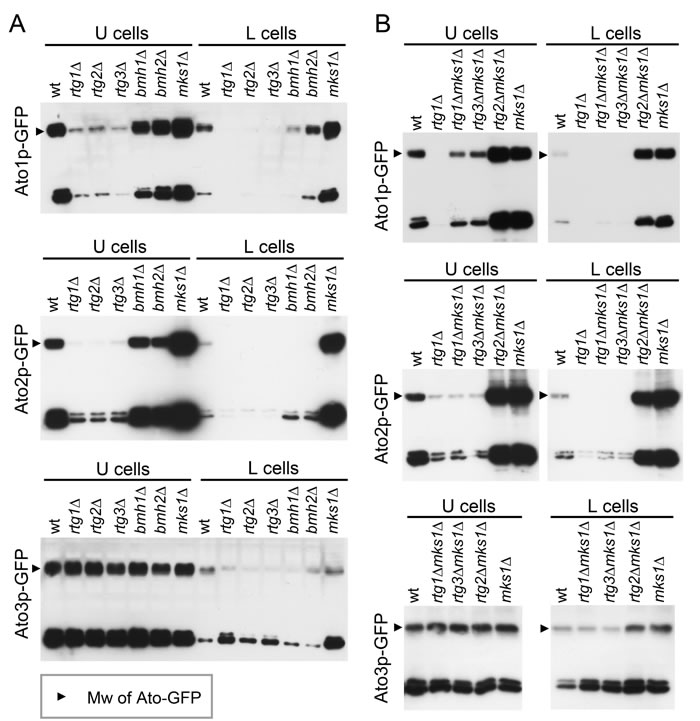 Rtg proteins and Mks1p regulate Ato1p and Ato2p production specifically in U cells