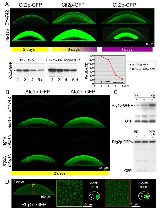 Figure 5: Effect of developmental phase on the production and localization of Ato1p, Ato2p, Cit2p, Rtg1p and Rtg2p in cells of colonies of different strains. A. Levels and localization of Cit2p-GFP within colonies occurring in acidic phase (left, yellow bar), immediately upon entering the alkali phase (center) and during the alkali phase (right, violet bar). Changes in the Cit2p-GFP levels in whole microcolonies of wt and mks1∆ strains during the interval of 2-5 days are shown below by WB analysis (left) and are quantified in the graph (right). B. Ato1p-GFP and Ato2p-GFP levels and localization within 2-day-old microcolonies occurring in acidic phase (marked by a yellow bar below the image) as determined by 2PE-CM. C. Amounts of Rtg1p-GFP and Rtg2p-GFP in three layers (starting from the top of the colony, layer 1) separated from 6-day-old acidic-phase giant colonies. D. Localization of Rtg1p-GFP in cells from 2-day-old microcolonies as determined by 2PE-CM. Up, upper part of the colony; low, lower part of the colony. Loading controls (for A and C) are in Figure S5.