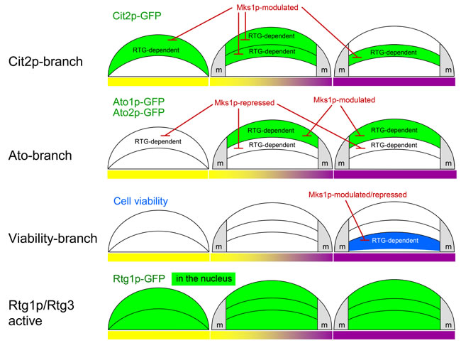 Figure 6: Summary of RTG regulation in developing colonies. Diagrammatic illustrations of the functions of proteins of three branches of the RTG pathway in cell subpopulations localized in different layers of colonies occurring in late acidic (left, yellow bar), early alkali (middle, yellow/violet bar) and fully alkali (right, violet bar) colonies. The repressing or modulating effect of Mks1p on Cit2p and Ato1p/Ato2p production is indicated. m, margin regions of colonies.
