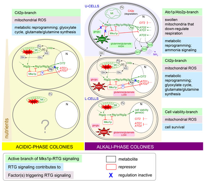 New data revealed that signaling from mitochondria via the RTG pathway is crucial in certain stages of the development and differentiation of yeast colonies. The inactivation of this signaling caused lethality to the specific cell subpopulation localized to lower layers of L cells and diminished the production of specific proteins in both U cells (Ato1p and Ato2p) and the upper layers of L cells (Cit2p) as well as in potential ancestors of these cells in acidic-phase colonies (Figure 6). Hence, signaling from mitochondria via the RTG pathway plays a role in all subpopulations of fully differentiated colonies and in some of their progenitors; however, the roles are different in particular subpopulations and result in different cell fates. As mitochondria with differently affected functionality are present in U versus L cells, the particular functional state of mitochondria could stimulate different targeting of RTG signaling in the three colonial cell subpopulations. The relation of the newly identified branches of RTG regulation to other pathways described previously in U and L cells and to the metabolic properties of these cell types are discussed below and summarized in model scheme (Figure 7).