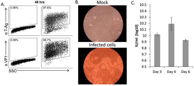 Figure 1: MCF7 cells support productive SV40 infection. A. FACS staining for SV40 L-TAg (upper dot plots) and VP1 (bottom dot plots) in SV40-infected MCF7 cells (MOI 10, right two dot plots) and mock-infected cells (left two dot plots). Percentage of positive cells is indicated. B. Cytopathic effect as seen by light microscopy in SV40 infected cells 4-5 days post infection (MOI 10). C. Quantification of SV40 infectious units (IU), produced 3, 4, and 6 days post infection in MCF7 cells. Shown are mean values ± SD. No infectious units were observed in mock-infected cells. Figure shows one representative experiment out of 3 performed.