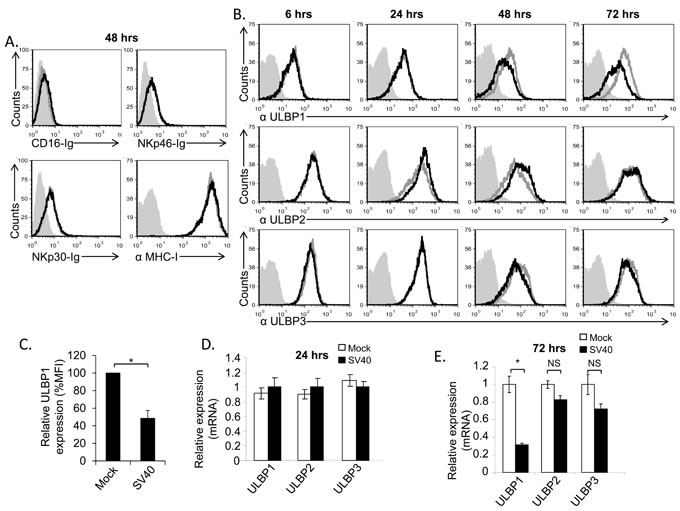 Figure 2: The stress-induced ligand ULBP1 is reduced following SV40 infection. A.-B. FACS analysis for the expression of major NK ligands on SV40 infected MCF7 cells (black open histogram, MOI 10) compared to mock infected cells (grey open histogram). Ligands were detected by fusion proteins (A), 48 hours post infection, and by mAbs (B) at the indicated time points. The fusion proteins/mAbs used are indicated below the histograms. The filled gray histogram represents the staining of the mock cells by secondary antibodies only. The background staining of all other cells was similar to the background staining of mock cells and is not shown in the figure. Figure combines 3 independent experiments. C. Quantification of ULBP1 downregulation in SV40 infected cells (72 hours post infection) relative to mock cells, determined by relative MFI (Mean Florescence Intensity) reduction. Shown are mean values ± SD. Statistically significant differences are indicated (*P < 0.002, by one-tailed t test). Error bars (SD) are derived from three independent experiments. D.-E. Expression level of ULBPs mRNA, determined by qPCR, 24 hours (hrs) (D) and 72hrs (E) post infection, in SV40 infected cells compared to mock infected cells. Statistically significant differences are indicated (* P < 0.02 by one-tailed t test). Error bars (SD) are derived from triplicates. Results are representative of three independent experiments. NS, not significant.