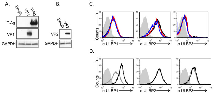 Figure 6: Induction of ULBP1 expression following large T-antigen expression. A., B. Western blot analysis for the expression of VP1, large T-Ag (A) and VP2 (B) in cells transduced with the relevant plasmid as indicated in the left of the figure, compared to cells transduced with empty vector. The backgrounds of WB images were adjusted for better visualization. C. FACS analysis for the expression of ULBPs (as indicated below the histograms) in MCF7 cells transduced with VP1 (red open histogram) or VP2 (blue open histogram) and in cells transduced with a control vector (black open histogram). The filled gray histogram represents the staining of the mock-infected cells by secondary mAb only. The background stainings of all other cells shown in the figure were similar to the background staining of mock cells and are not shown in the figure. Figure shows one representative experiment out of three performed. D. FACS analysis for the expression of ULBPs (as indicated below the figures) in MCF7 cells transduced with SV40 L-TAg (black open histogram), compared to cells transduced with a control vector (gray open histogram). The filled gray histogram represents the staining of the control vector cells by secondary antibodies only. The background staining of SV40 L-TAg was similar to the background staining of control vector cells and is not shown in the figure. Figure shows one representative experiment out of three performed.