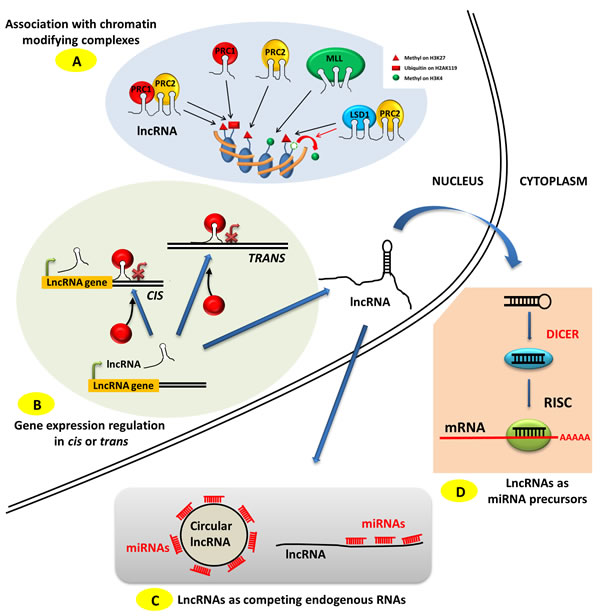 Figure 1: Modes of action of lncRNAs. A. LncRNAs can associate with various chromatin-modifying complexes such as PRC1, PRC2 and MLL and guide them to specific chromosome locations. PRC1 and PRC2 deposit the transcriptional repressing marks H2AK119Ub1 and H3K27Me3 respectively, and MLL deposits the transcriptional activating mark H3K4Me3. LncRNAs can act as a scaffold by coordinating the action of several chromatin-modifying complexes such as PRC1 and PRC2 or PRC2 and LSD1, the latter removing the transcriptional activating methyl groups on H3K4. B. LncRNAs can address chromatin-modifying complexes to specific genomic loci in the vicinity of their transcription site, i.e. in cis, or at distant sites on the same or different chromosomes, i.e. in trans. C. LncRNAs, either linear or circular, can act as competing endogenous RNA (ceRNAs), sequestrating miRNAs from their mRNA targets. D. LncRNAs can act as precursor RNAs for miRNAs.