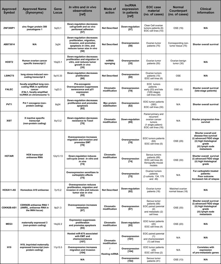 Despite the diversity and vast repertoire of lncRNAs, only a handful of them have been shown to be involved functionally in ovarian carcinoma biology or have been proposed as possible biomarkers. Some of these lncRNAs have been studied extensively for their role in several malignancies, whereas the available literature is still rather limited for others. Table 1 combines the lncRNAs that have been studied in the context of ovarian carcinoma, while the available information about their roles and functions is discussed below.