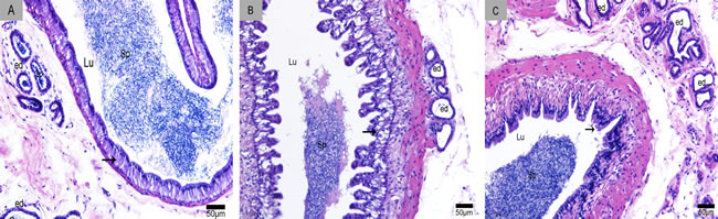 Figure 1: Sperm storage in the epididymis. A. caput, B. corpus and C. cauda. Lu: lumen; Sp: spermatozoa; arrowhead: epididymal epithelium; ed: efferent duct; H & E stain; Bars: A, B, C = 50 µm.