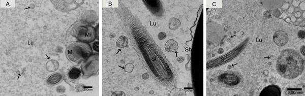 Figure 3: Electron micrograph of nano-scale exosomes (arrowhead) around spermatozoa in the epididymal lumen. A. caput, B. corpus, C. cauda. Lu: lumen; Mi: mitochondria; St: sperm tail; Sh: sperm head; Bars: A, B = 250 nm; C = 500 nm.