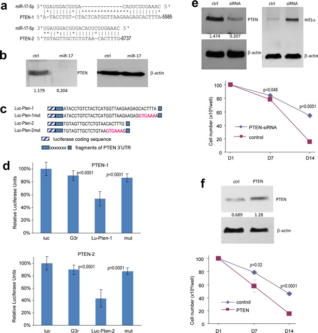 PTEN is a tumor suppressor which dominates the PTEN/HIF-1α pathway. Inactivation of PTEN often allows for the over-expression of HIF-1α, leading to cascade reactions in angiogenesis and migration. It has been reported that PTEN is a target of the miR-17-92 cluster, and indeed we detected two potential binding sites for miR-17 in PTEN 3’UTR (Fig 3a). Western blot was employed to analyze PTEN levels in the miR-17-transfected cells. Compared with the control cells, PTEN was down-regulated in cells over-expressing miR-17 (Fig 3b). The luciferase assay was then employed to determine whether miR-17 could target PTEN directly. Fragments in PTEN 3’UTR containing the binding sites of miR-17 were cloned into the pMir-report vector. Constructs with mutated binding sites were also generated to serve as controls (Fig 3c). U87 cells were co-transfected with miR-17 plasmid and one of the luciferase constructs. The experiments showed that luciferase activities were repressed when the luciferase constructs were co-transfected with miR-17 plasmid, and the inhibitory effect of miR-17 was abolished when the binding sites were mutated (Fig 3d). We then transfected U87 cells with siRNA targeting PTEN, which confirmed silencing of PTEN expression (Fig 3e, left). Down-regulation of PTEN led to increased expression of HIF-1α (Fig 3e, right), and thus prolonged the survival of the cells (Fig 3e, lower).