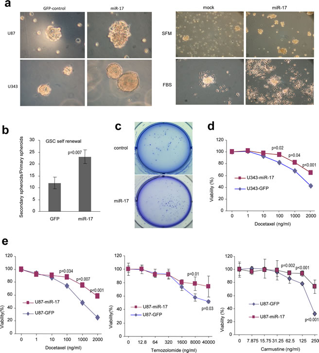 Figure 4: MiR-17 promotes the generation of tumor stem-like cells. (a) U87 and U343 cells stably transfected with miR-17 or the control vector were cultured in serum-free medium for two weeks. Cells expressing miR-17 formed significantly larger spheres than those transfected with the mock control (left). The sphere cultures were continued to be maintained in serum-free medium, which induced extensive cell death in the control cells, but not in the miR-17-transfected cells. Addition of FBS into the cultures induced cell adhesion to the plate, displaying survivability of the spheres (right). (b) The numbers of spheres were counted and passed to new plates for continuing culture. Spheres formed in the secondary plates were divided by the numbers formed in the primary plates to evaluate the formation of spheres in the secondary plates. (c) In colony formation assays performed in soft agar, miR-17-expressing cells form more colonies with larger sizes. (d) The miR-17- and vector-transfected U343 cells were cultured and treated with Docetaxel. Sensitivities of the cells to the drug were tested. Cells transfected with miR-17 displayed resistance to Docetaxel-induced cell death. (e) The miR-17- and vector-transfected U87 cells were cultured and treated with Docetaxel, Carmustine and Temozolomide, followed by analysis of cellular viability. Cells transfected with miR-17 displayed resistance to all drugs.