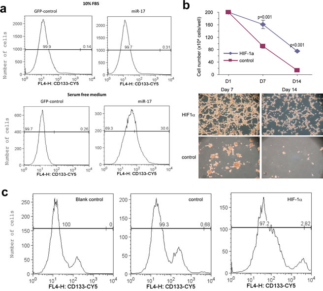 Figure 5: Regulation of CD133 activity by miR-17. (a) The miR-17- and vector-transfected U87 cells were subjected to flow cytometry to measured CD133 expression. CD133 expression was higher in the miR-17-transfected cells than the control cells in serum-containing medium (0.31% vs. 0.14%) or serum-free medium (30.6% vs. 0.26%). (b) Upper, U87 cells were transfected with HIF-1α or the mock vector, followed by analysis of cell survival. Transfection of HIF-1α mimicked miR-17’s function in survival. Lower, Typical photos are shown. (c) The HIF-1α- and vector-transfected U87 cells were analyzed for CD133 expression. Transfection of HIF-1α increased CD133 level (2.8% vs. 0.68%).