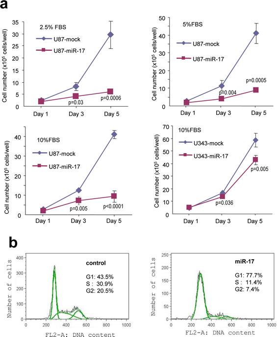 In order to examine the effect of miR-17 on glioblastoma cell growth, a cell proliferation assay was performed and miR-17-overexpressing cells were found to have a significantly reduced growth rate (Fig 6a). This was in line with cell cycle analysis, in which the percentage of cells in G1 phase was much higher in miR-17-overexpressed cells as compared with the control (Fig 6b). Our findings indicated that miR-17 inhibited glioblastoma cell proliferation, which is in agreement with other studies revealing similar results on breast cancer cells [47]. Taken together, these results suggest that miR-17 suppresses glioblastoma cell growth under normal circumstances.