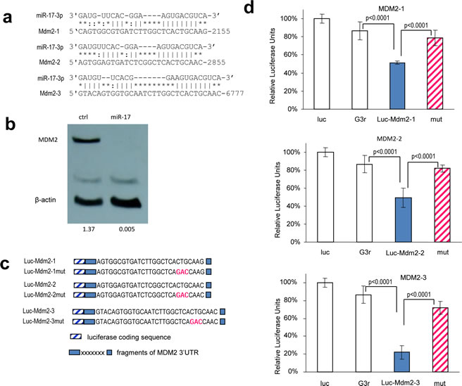Figure 7: MiR-17-5p and miR-17-3p target MDM2. (a) Computational analysis showed that miR-17-5p and miR-17-3p potentially targeted MDM2 at three different sites. (b) Cell lysate prepared from miR-17- or mock-transfected U87 cells was analyzed on Western blot for MDM2 protein expression. MDM2 level was down-regulated in miR-17-transfected cells. Staining of β-actin from the same membrane confirmed equal loading. (c) Three luciferase constructs were generated, each containing a fragment harboring the target site of miR-17-3p, producing Luc-Mdm2-1, Luc-Mdm2-2, and Luc-Mdm2-3. Mutations were generated on the seed regions of each target sequence (red color), resulting in four mutant constructs Luc-Mdm2-1mut, Luc-Mdm2-2mut, and Luc-Mdm2-3mut. (d) U87 cells were co-transfected with miR-17-3p and each of the luciferase reporter constructs or the mutants. The luciferase reporter vector (Luc) and the vector harboring a non-related region (G3R) were used as controls. Asterisks indicate significant differences. Error bars, SD (n=3).