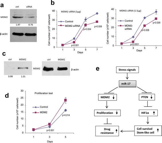 We then validated whether MDM2 played an essential role in modulating U87 cell activities. The cells were transfected with siRNA complementary to MDM2. Silencing of MDM2 was confirmed using Western blotting (Fig 8a), and knockdown of MDM2 reduced cell proliferation (Fig 8b). To corroborate this result, we performed rescue experiments by transfecting U87 cells with MDM2 expression construct. After confirming up-regulation of MDM2 (Fig 8c), the effect of MDM2 on cell proliferation was tested, and we found that over-expression of MDM2 in the miR-17-transfected cells resulted in enhanced cell growth (Fig 8d).