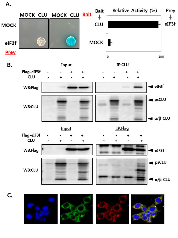 Figure 1: CLU interacts with eIF3f in the cytoplasm. A. Transformants were tested for their ability to grow on medium lacking leucine (left) and expressing β-galactosidase (right). The interaction between eIF3f and CLU was assessed by relative β-galactosidase expression. B. HEK293a cells were transfected with expression vectors encoding the indicated proteins. After 2 days, cell lysates were immunoprecipitated using anti-CLU or -FLAG antibodies and immunoblotted using anti-CLU or -FLAG antibodies. C. ICC was performed in HeLa cells using anti-eIF3f and -CLU antibodies, and the nuclei were stained with 4’,6-diamidino-2-phenylindole. Cells were imaged using a confocal fluorescence microscope. The sub-cellular localization of eIF3f (green) and CLU (red) and their co-localization (yellow) are shown (magnification, ×400).