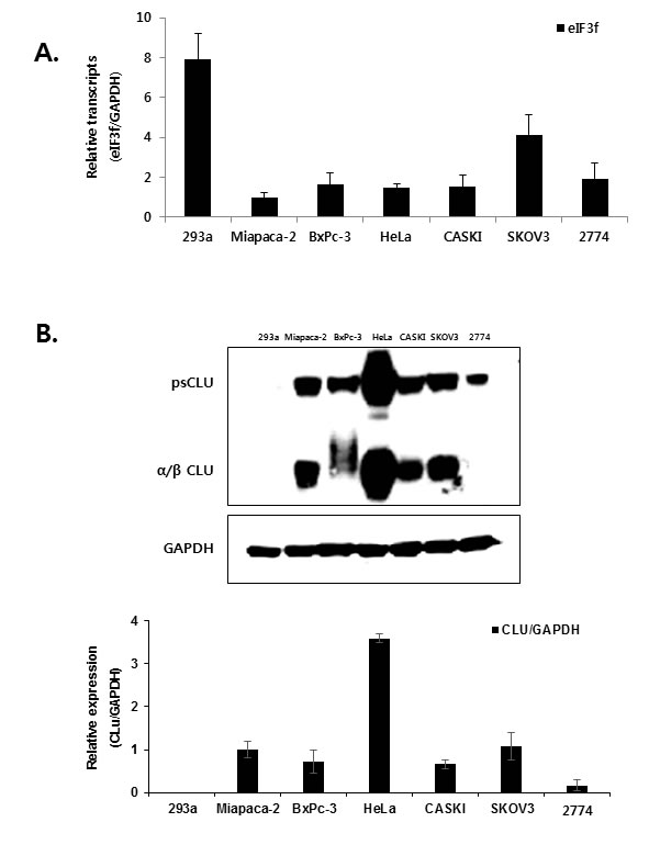 Figure 2: Expression of eIF3f and CLU. A. Total RNA was isolated from a normal cell line (HEK293a), pancreatic cancer cell lines (Miapaca-2, BxPc-3), cervical cancer cell lines (HeLa, CASKI), and ovarian cancer cell lines (SKOV3, 2774). The expression of eIF3f mRNA was then analyzed using qRT-PCR and normalized to glyceraldehyde-3-phosphate dehydrogenase (GAPDH) mRNA. B. Whole-cell lysates were isolated from the same cancer cell lines described in A. and analyzed using Western blotting. The density of the bands was quantified using Image J software, and CLU protein levels were reported as the CLU:GAPDH ratio.