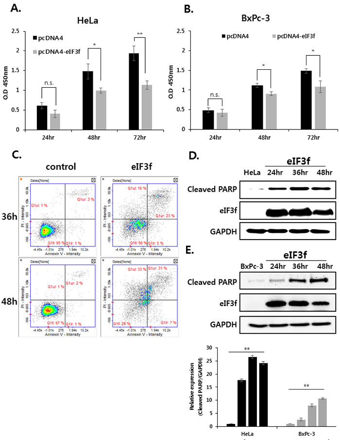 Figure 3: Overexpressed eIF3f inhibits cancer cell proliferation and induces apoptosis. The same number of HeLa A. and BxPc-3 B. cells were plated in triplicate in 96-well plates. The O.D value of cells was then measured at the indicated time points. C. HeLa cells were transfected with pcDNA4 or pcDNA4-eIF3f. At the indicated time points, cells were analyzed using flow cytometry. Representative dot plots of Annexin V/PI staining in HeLa cells are shown. HeLa D. and BxPc-3 E. cells were transfected with pcDNA4-eIF3f and harvested at 24-h intervals. eIF3f or cleaved PARP was then detected using Western blotting. F. One thousand HeLa cells transfected with control pcDNA4 or pcDNA4-eIF3f were re-seeded in 100-mm cell culture dishes and incubated for 2 weeks to allow colony formation. The media were then removed, and colonies were stained with 5% crystal violet. The plates were rinsed with water, and the total colony numbers were counted. The same cell lysates were also used to evaluate eIF3f expression using Western blotting.